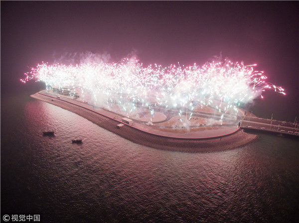 2017年12月31日,港珠澳大橋全線亮燈,標志著全線供電照明系統(tǒng)施工圓滿完成,意味著港珠澳大橋主體工程已經(jīng)具備通車條件。亮燈儀式上,大橋東人工島四周燃放起壯麗的煙花。