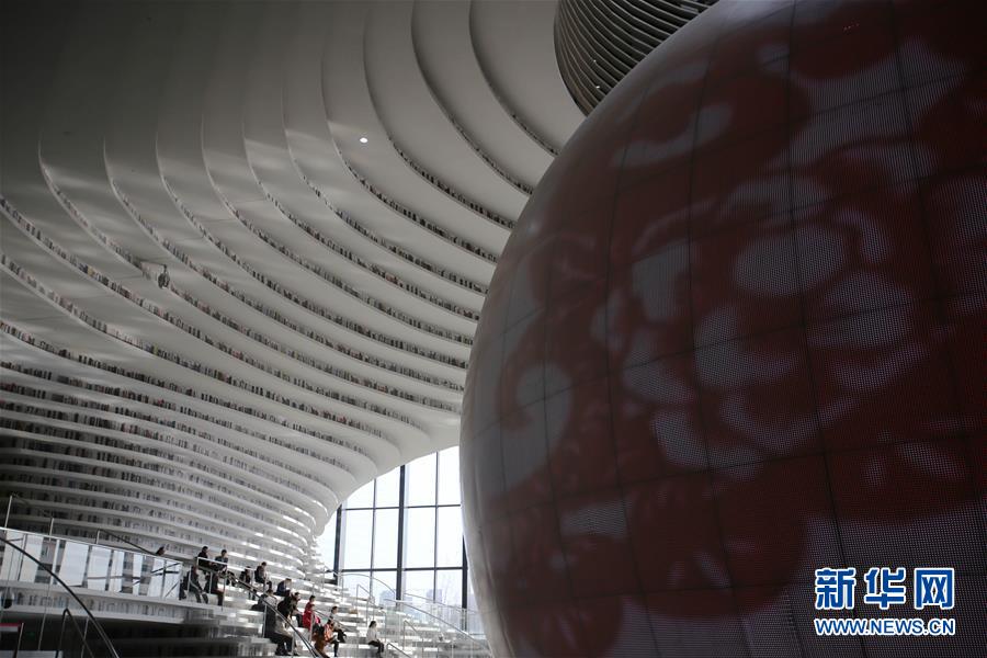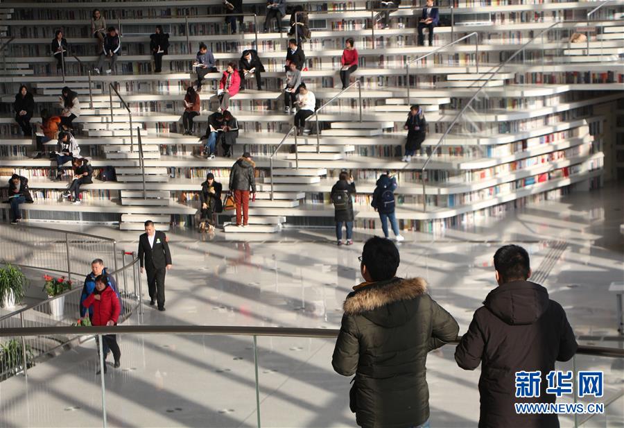 12月27日,讀者在天津濱海新區(qū)圖書館的“書山”上參觀。 濱海新區(qū)圖書館位于天津濱海文化中心,2017年10月1日正式開館,設計立意為“濱海之眼”和“書山有路勤為徑”。圖書館現(xiàn)有藏書60多萬冊,一年多來接待讀者約280萬人次,已成為濱海新區(qū)的文化“新地標”。 新華社記者段卓力攝