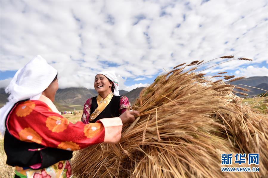 9月23日,首個(gè)中國農(nóng)民豐收節(jié),拉薩市林周縣松盤鄉(xiāng)松盤村兩名藏族農(nóng)民在田間聊天。 新華社記者 覺果 攝