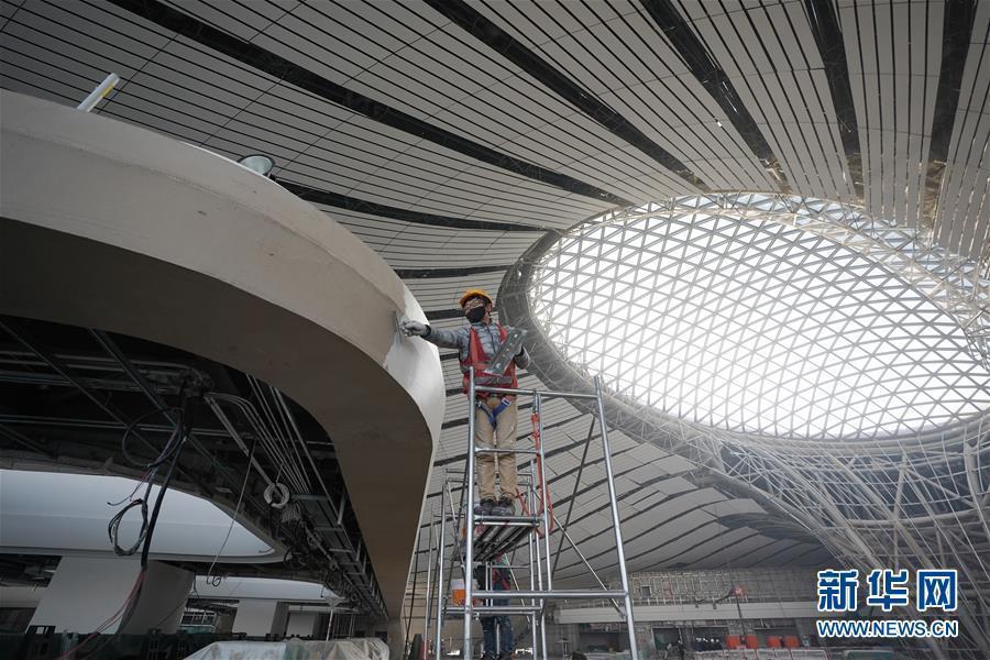 在北京大興國(guó)際機(jī)場(chǎng)主航站樓內(nèi),施工人員在進(jìn)行裝飾裝修工作。新華社記者 鞠煥宗 攝 圖片來(lái)源:新華網(wǎng)