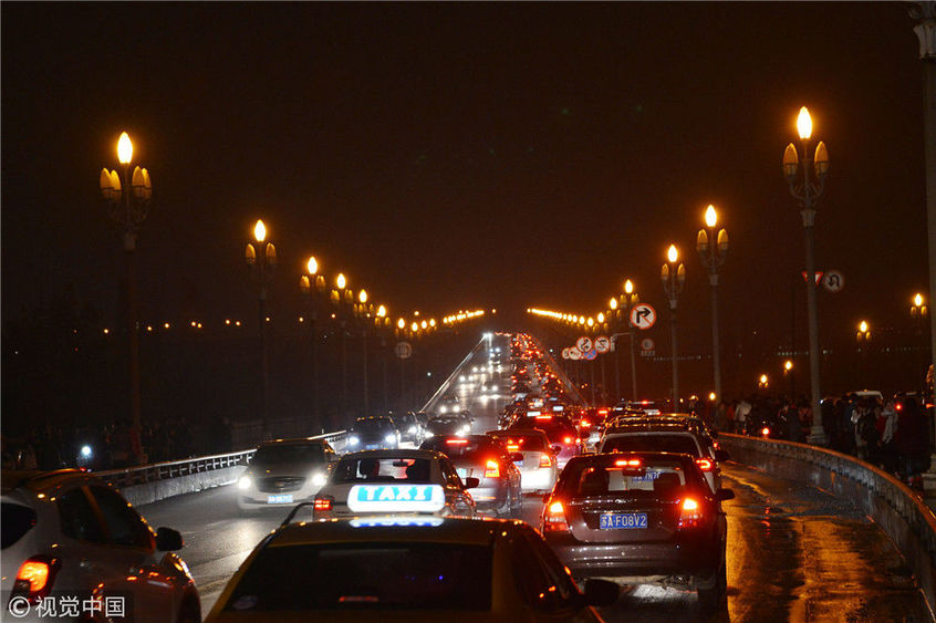 維修改造后的南京長(zhǎng)江大橋全線恢復(fù)通車。市民在觀看南京長(zhǎng)江大橋通車。