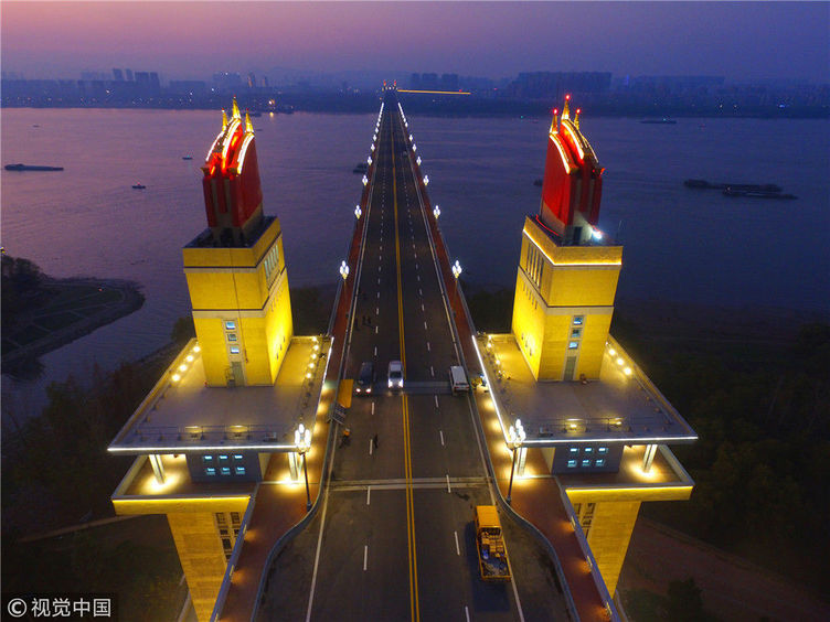 2018年12月13日,江蘇南京,“一橋飛架南北,天塹變通途。”作為我國(guó)第一座自行設(shè)計(jì)和建造的雙層鐵路、公路兩用橋,南京長(zhǎng)江大橋在我國(guó)橋梁史上的重要地位不言而喻。從1968年建成后的48年間,它就如同一條巨龍,始終在長(zhǎng)江上默默守護(hù)著人來(lái)車往。南京長(zhǎng)江大橋上層是公路橋,下層為雙軌復(fù)線鐵路橋,連接津浦鐵路與滬寧鐵路干線,是我國(guó)南北交通要津和命脈。近年來(lái),由于南京長(zhǎng)江大橋公路橋的實(shí)際通行荷載遠(yuǎn)超原先設(shè)計(jì)標(biāo)準(zhǔn),不僅橋面上擁堵?,F(xiàn),橋梁本身的種種“病害”也日益加深。圖為2018年12月13日,夜幕降臨,南京長(zhǎng)江大橋歸位后的玉蘭花燈重新點(diǎn)亮。大橋玉蘭花燈柱共有299根,每根燈柱上有5盞玉蘭花燈,1大4小,一共1495盞。方東旭/視覺(jué)中國(guó)