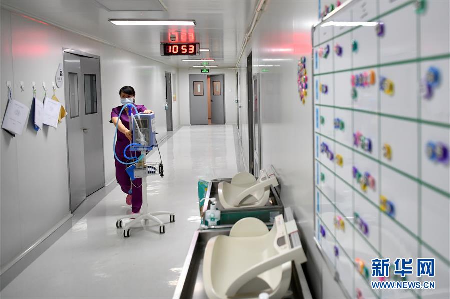12月30日,山西省兒童醫(yī)院新生兒重癥監(jiān)護室醫(yī)生王榮華在搬運無創(chuàng)呼吸機。新華社記者曹陽攝
