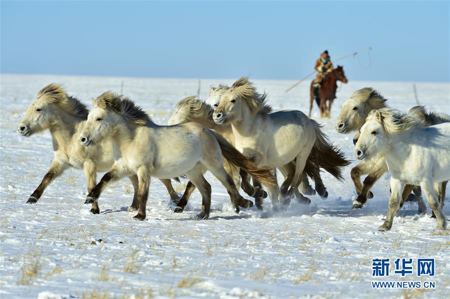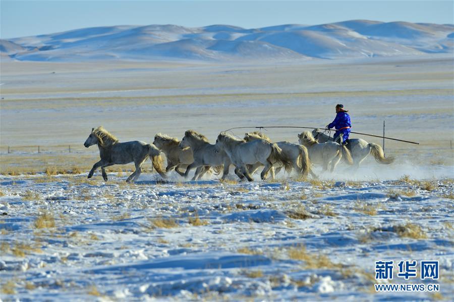 1月8日,牧民在馴服一匹烈馬。 時(shí)下正值草原冬季旅游旺季,內(nèi)蒙古自治區(qū)西烏珠穆沁旗的牧民們?cè)谘┰弦徽股硎?,為游客展現(xiàn)獨(dú)特的民族風(fēng)情。 新華社記者 鄒予 攝