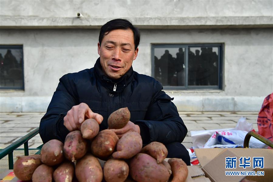 1月13日,村民在展銷(xiāo)活動(dòng)上售賣(mài)紅薯。 新華社記者 馮大鵬 攝