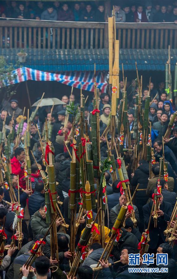 1月14日,人們?cè)趶V西融水苗族自治縣紅水鄉(xiāng)舉行的蘆笙節(jié)上賽蘆笙。