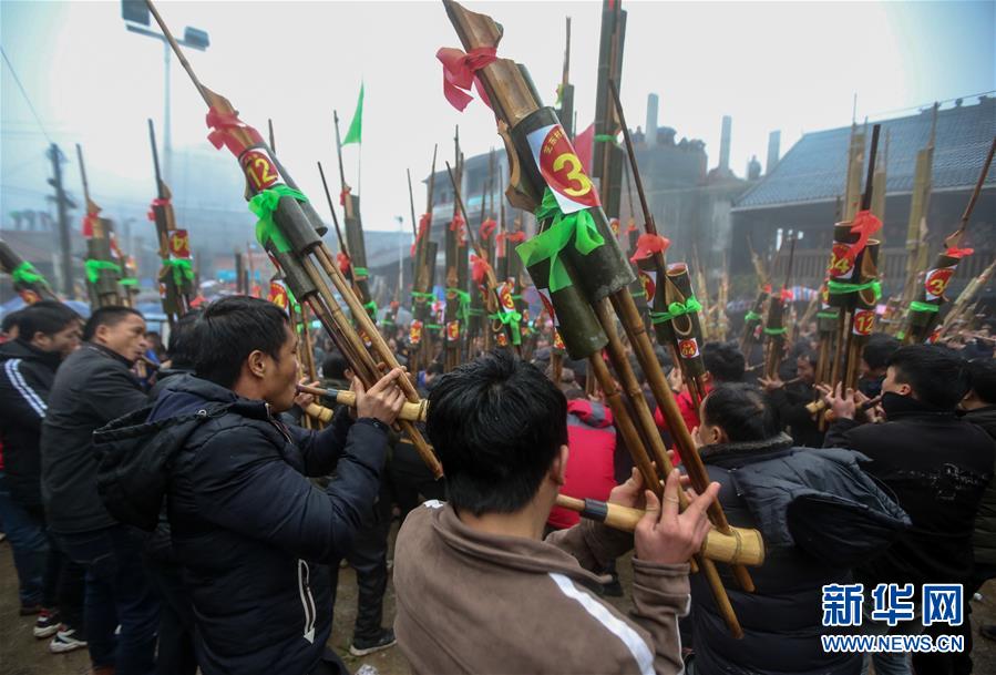 1月14日,人們?cè)趶V西融水苗族自治縣紅水鄉(xiāng)舉行的蘆笙節(jié)上賽蘆笙。新華社記者 陳君清 攝
