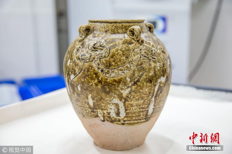 近日,廣東省博物館文物保護(hù)科技中心出水文物保護(hù)實(shí)驗(yàn)室里,一個(gè)修復(fù)后的出水明代四系醬釉龍紋罐。譚慶駒 攝 圖片來源:視覺中國