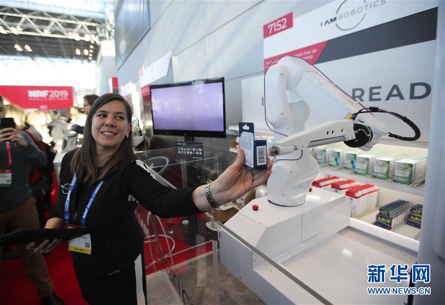1月14日,在美國紐約舉行的全國零售商聯(lián)合會年度大會的“創(chuàng)新實驗室”展廳,工作人員從自動取貨機(jī)器人“手中”取下貨品。 美國全國零售商聯(lián)合會年度大會于1月13日至15日在紐約舉行,許多來自世界各地的展商帶來使用新技術(shù)開發(fā)出的軟硬件產(chǎn)品,向觀眾展示未來零售業(yè)的新愿景。 新華社記者 王迎 攝