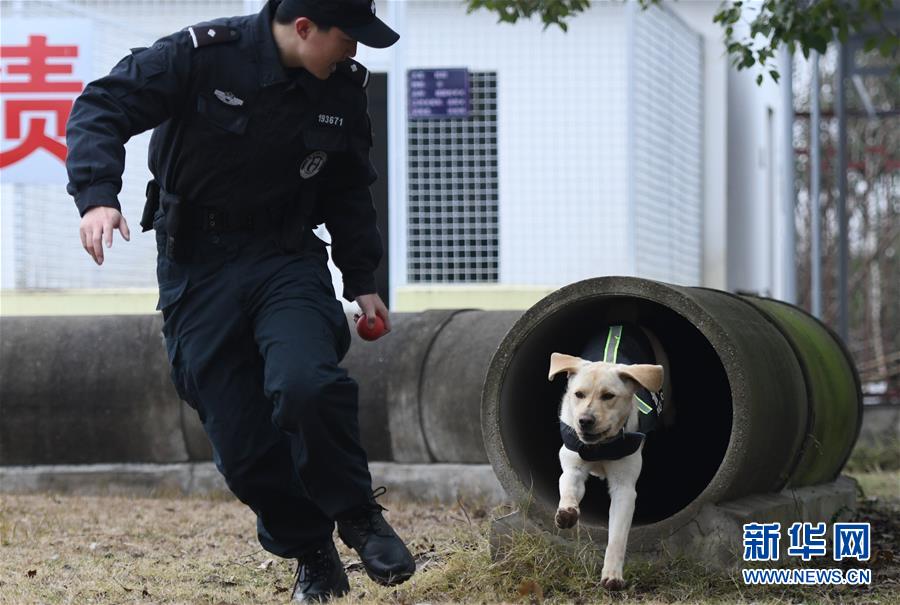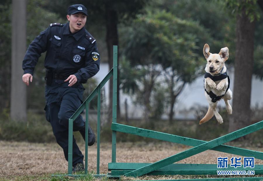 1月15日,警犬“皮特”在訓導員丁巖的帶領下進行崗前特訓。 新華社記者 程敏 攝