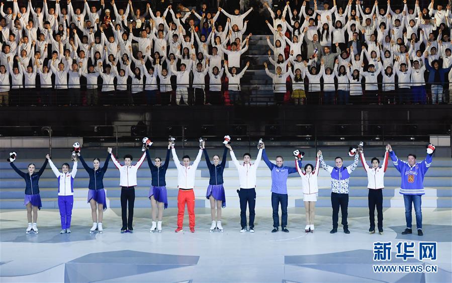 1月15日,中芬運(yùn)動員代表攜手向觀眾致意。 當(dāng)日,“2019中芬冬季運(yùn)動年”開幕式在北京首鋼冰球館舉行。 新華社記者申宏攝