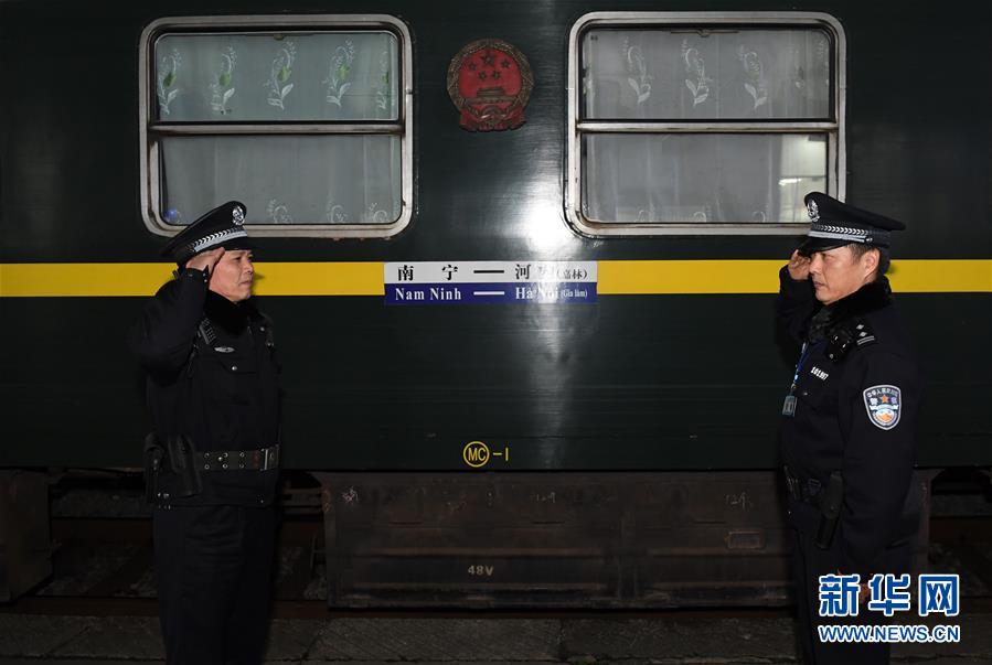 在廣西憑祥火車站,鐵路公安民警陸日峰(左)和乘警楊鐵鳴交接工作(2018年12月31日攝)。 新華社記者陸波岸攝