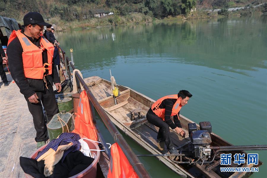 1月22日,何銀祥(左)在駕駛小船,他駕駛的小船是大船的動力來源。 新華社記者 歐東衢 攝