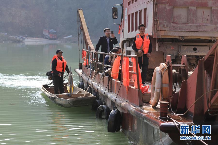 1月22日,何銀祥(左)在駕駛小船,他駕駛的小船是大船的動(dòng)力來源。 新華社記者 歐東衢 攝