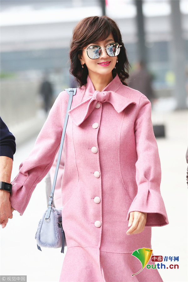 1月22日,廣東深圳,近日,趙雅芝與丈夫黃錦燊現(xiàn)身機場,黑超遮面的她身著粉色昵子魚尾大衣,氣質(zhì)超群,一路獲粉絲跟隨,共先生黃錦燊牽手同行。