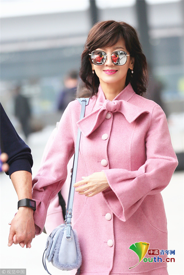 趙雅芝著粉嫩魚尾大衣優(yōu)雅甜美 獲老公一路牽手