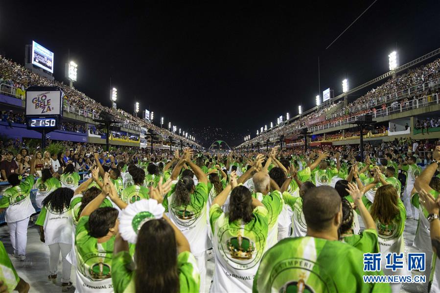 3月3日,在巴西里約熱內(nèi)盧,特級(jí)組桑巴舞校工作人員參加狂歡節(jié)游行。 3月3日晚,2019年里約熱內(nèi)盧狂歡節(jié)特級(jí)組桑巴舞校在桑巴大道開始花車巡游表演。 新華社記者李明攝
