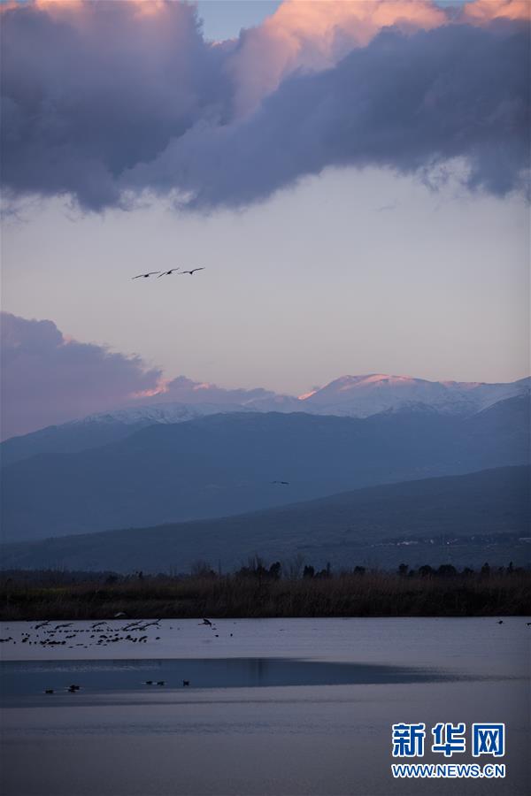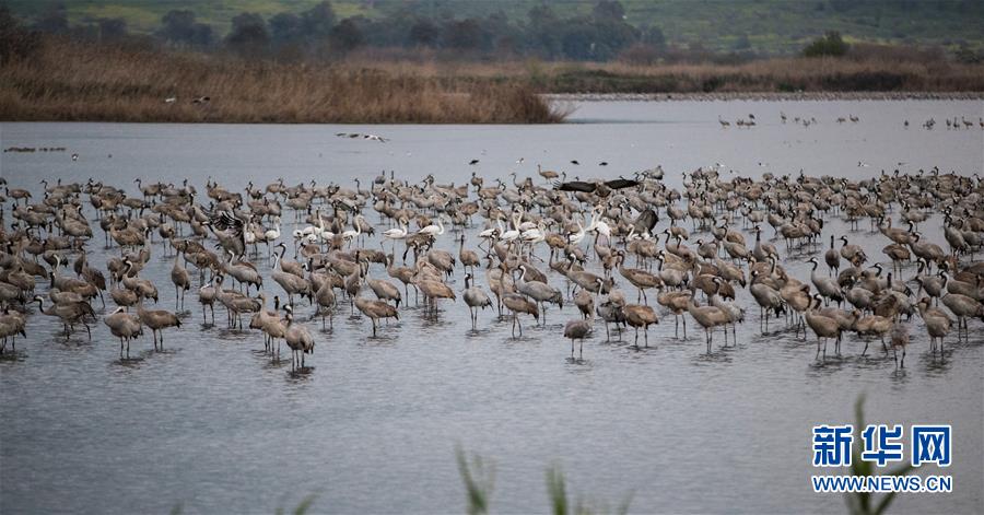 3月7日,在以色列阿格蒙胡拉鳥(niǎo)類(lèi)和自然公園,幾只灰鶴在水邊休息。新華社記者郭昱攝