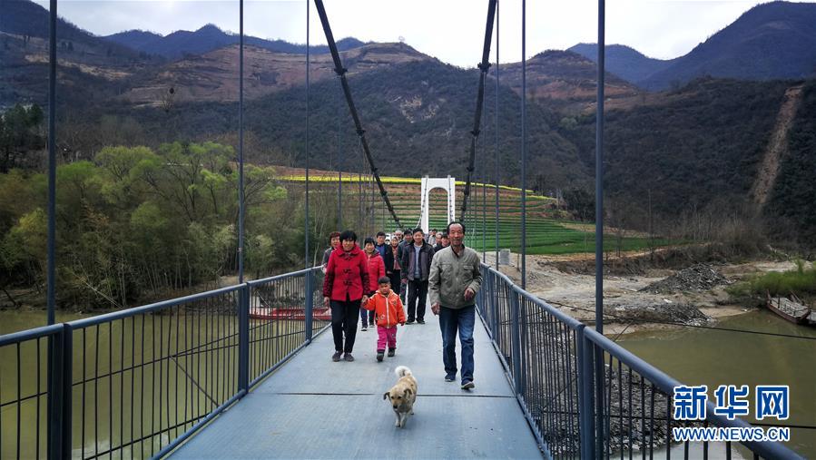 3月25日,略陽縣徐家坪鎮(zhèn)藥木院村村民走在新修的鋼結構吊橋上。 新華社記者陶明攝