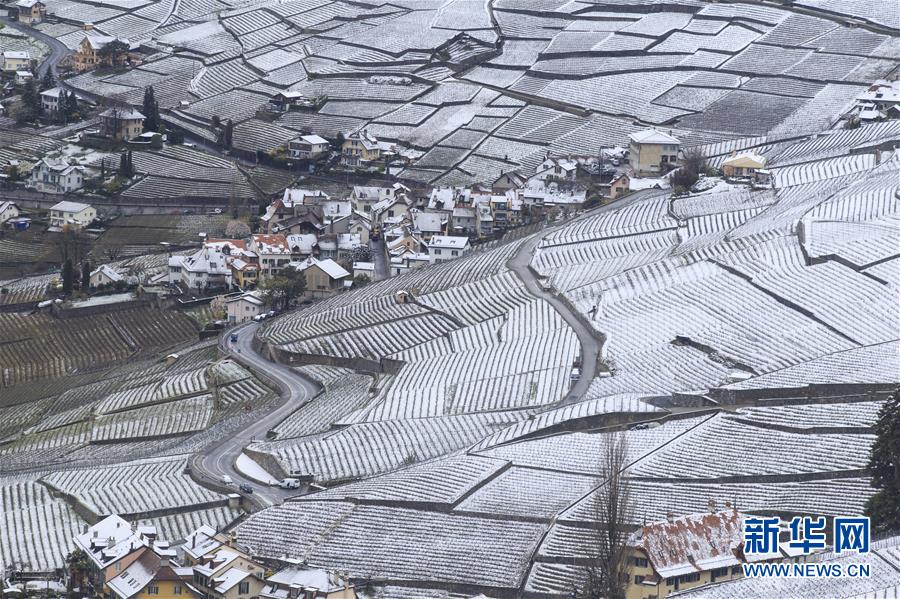 這是4月4日在瑞士西部拉沃地區(qū)拍攝的雪后梯田式葡萄園美景。