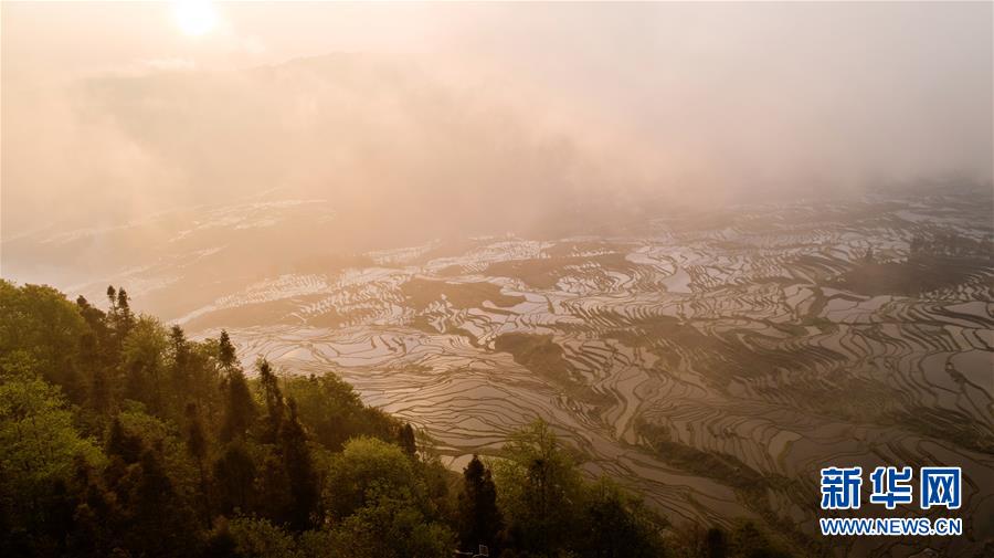 這是在云南省元陽(yáng)縣拍攝的晨曦中的哈尼梯田美景(4月4日無(wú)人機(jī)拍攝)。哈尼梯田位于云南省哀牢山南部,以哈尼族為主的當(dāng)?shù)厝罕娗О倌陙?lái)生生不息在大地上“雕刻”出這一農(nóng)耕文明奇觀。春日里,漫山的水稻梯田與云海、森林、村莊形成一幅美麗的畫(huà)卷,吸引眾多海內(nèi)外游客前來(lái)觀賞。新華社記者 胡超 攝
