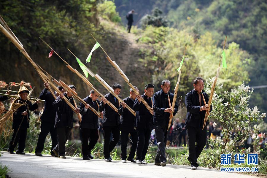 4月7日,苗族群眾吹著蘆笙走在參加“三月三”民俗活動(dòng)途中。4月6日至7日,在貴州省黔東南苗族侗族自治州劍河縣觀么鎮(zhèn)新民村和新合村,來自劍河縣和三穗縣的苗族同胞歡聚一堂,通過民族歌舞展演、非遺手工藝展示、千戶祭“巫耶”、跳蘆笙舞等形式,與來賓一起歡慶2019年高雍苗族“三月三”民俗文化節(jié)。 新華社記者 楊文斌 攝
