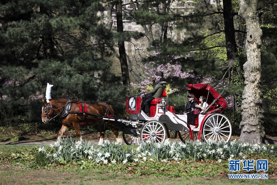 4月16日,人們在美國紐約中央公園乘坐馬車游玩。 新華社記者 王迎 攝