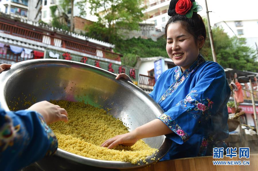 4月16日,在貴州省臺江縣姊妹街哆蝶五彩姊妹飯體驗店,苗家婦女在制作五彩“姊妹飯”。新華社發(fā)(劉開福 攝)