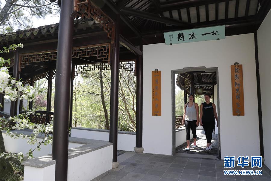 2017年4月28日,游客在美國紐約寄興園內(nèi)游覽。仿照中國蘇州園林設計建造的寄興園位于紐約斯塔滕島,占地面積約4000平方米,其所用的建筑材料大都在蘇州加工制造,并由40名來自蘇州的藝術家和工匠歷時6個月在紐約修建而成。 新華社記者王迎攝