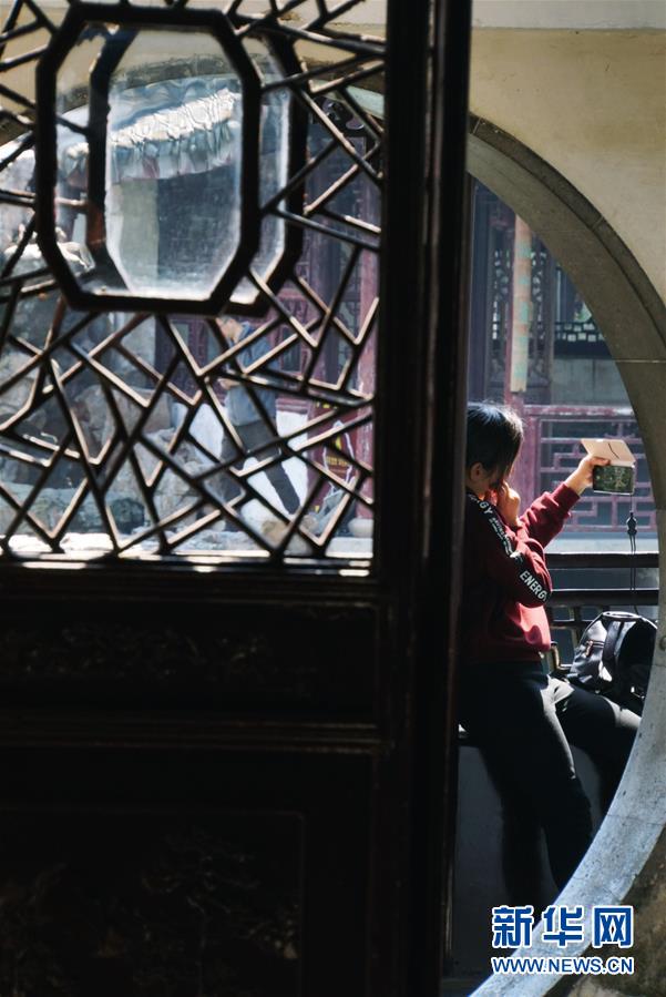 2019年4月1日,游客在中國蘇州網(wǎng)師園內(nèi)自拍。1997年,網(wǎng)師園和拙政園、留園、環(huán)秀山莊被列入聯(lián)合國教科文組織世界文化遺產(chǎn)名單。 新華社記者杜涓涓攝
