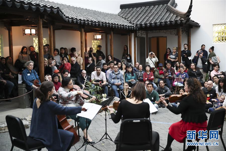 2018年2月24日,人們在美國紐約大都會博物館“明軒”欣賞演出,慶祝新春佳節(jié)。中式庭院“明軒”是中國第一個落戶海外的蘇式園林,位于美國紐約大都會博物館二層的玻璃天棚下,是模仿中國蘇州網(wǎng)師園中的“殿春簃”設計建造而成的?!懊鬈帯庇商K州市園林管理局承建,所用的磚、瓦、木材、構件等在中國備好后,由20余名中國工程師和工匠在美國組裝。 新華社記者王迎攝