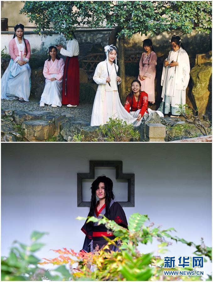 這張拼版照片展示的是:上圖,2019年4月1日,游客在中國蘇州耦園內(nèi)身著古裝拍照(新華社記者杜涓涓攝);下圖,2019年4月13日,一名當?shù)赜慰驮诘聡D分惺綀@林“多景園”內(nèi)身著古裝拍照(新華社記者逯陽攝)。