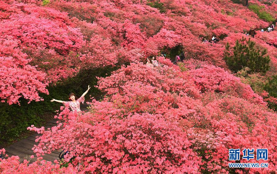4月25日,游客在龜峰山杜鵑花海中游玩。 近日,湖北省麻城市龜峰山的10萬畝古杜鵑盛開,大量游客前來賞花觀景。 新華社記者 程敏 攝