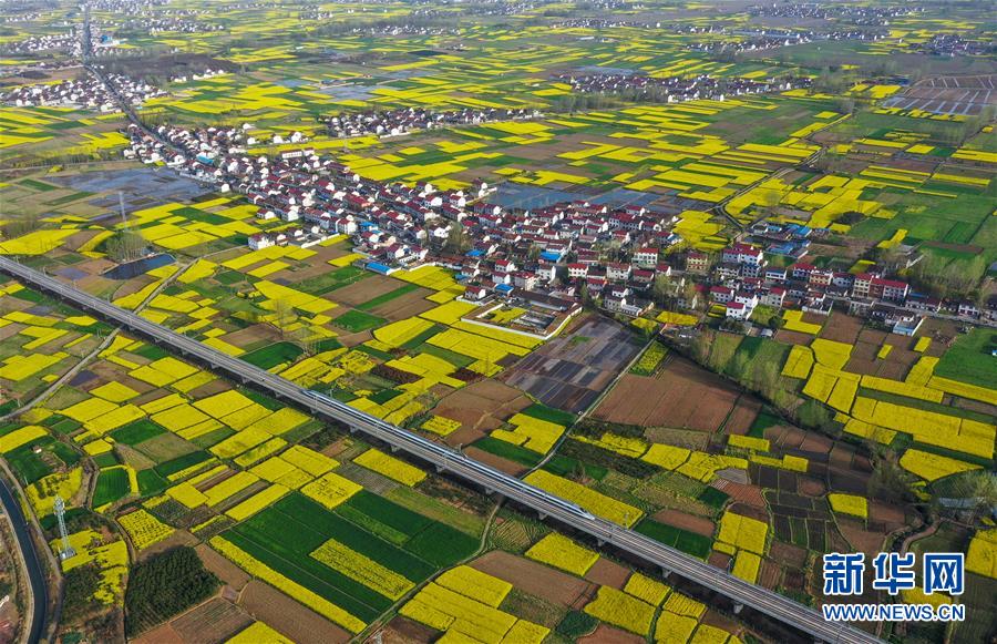 在陜西省漢中市城固縣境內(nèi),高鐵穿行在盛開的油菜花田間(3月28日無(wú)人機(jī)拍攝)。 新華社發(fā)(羅漢濤 攝)