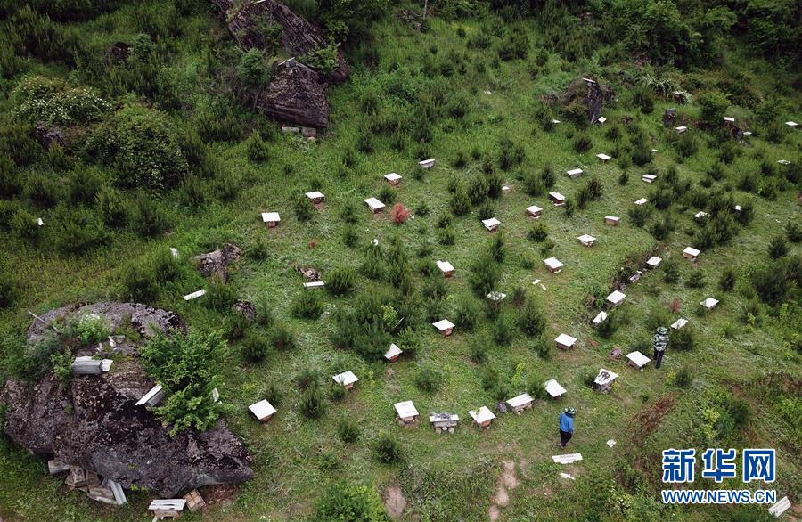 5月10日,在甘肅省隴南市徽縣大河店鎮(zhèn)硬灣村,蜂農(nóng)查看蜂箱情況(無人機拍攝)。 甘肅省隴南市徽縣大河店鎮(zhèn)硬灣村位于秦巴山區(qū)深處,2017年,在當?shù)卣姆龀窒?,龍崖老巢蜜養(yǎng)殖農(nóng)民專業(yè)合作社成立,蜂農(nóng)們將傳統(tǒng)養(yǎng)蜂技藝和現(xiàn)代加工方式相結(jié)合,并通過電商等渠道打開銷路,有效帶動了當?shù)刎毨Т迕衩撠氈赂?。目前整個合作社共有蜂箱2000余個,每箱每年可帶來三四千元的收入。 新華社記者 馬寧 攝
