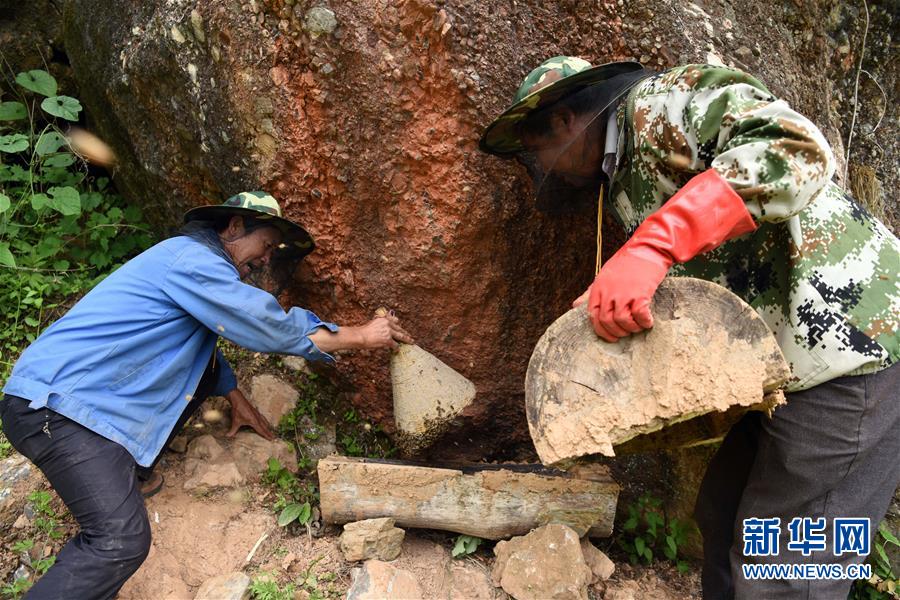 5月10日,在甘肅省隴南市徽縣大河店鎮(zhèn)硬灣村,蜂農(nóng)李成(左)和劉輝林在收蜂。 甘肅省隴南市徽縣大河店鎮(zhèn)硬灣村位于秦巴山區(qū)深處,2017年,在當(dāng)?shù)卣姆龀窒?,龍崖老巢蜜養(yǎng)殖農(nóng)民專業(yè)合作社成立,蜂農(nóng)們將傳統(tǒng)養(yǎng)蜂技藝和現(xiàn)代加工方式相結(jié)合,并通過(guò)電商等渠道打開(kāi)銷(xiāo)路,有效帶動(dòng)了當(dāng)?shù)刎毨Т迕衩撠氈赂?。目前整個(gè)合作社共有蜂箱2000余個(gè),每箱每年可帶來(lái)三四千元的收入。 新華社記者 馬寧 攝