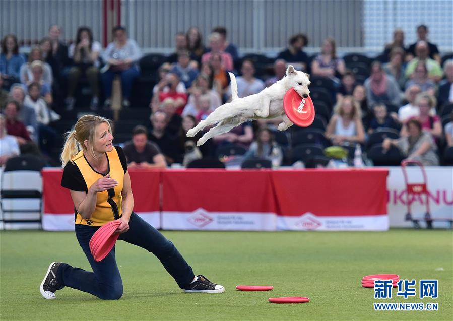 5月19日,在德國多特蒙德舉行的寵物展上,訓犬師沃爾夫帶著愛犬進行“狗接飛盤”表演。 為期三天的德國多特蒙德“狗和貓”寵物展19日落幕。寵物展期間,人們帶著自己的“萌寵”來到會場,參與寵物跳水、舞蹈、選美等趣味比賽,并與其他寵物愛好者及展商交流互動。 新華社記者逯陽攝