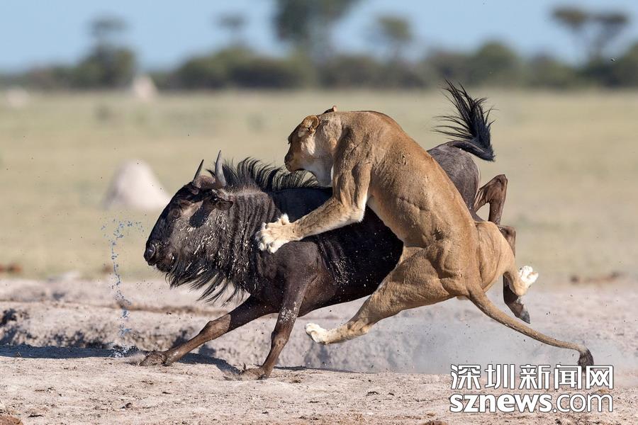 英國攝影師蘇-莫里斯(Sue Morri)在博茨瓦納Nxai Pan國家公園游玩,目睹了一場兇惡母獅獵食角馬的畫面。母獅甚至攀到了角馬背上,想要牢牢遏制住到手的“美餐”。強(qiáng)壯的角馬努力地與母獅抗?fàn)?,竭力想要保住自己的性命,但最終還是不敵母獅被拿下,最后成了母獅孩子們的盤中餐。