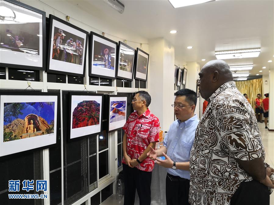 5月29日,在斐濟蘇瓦,中國駐斐濟大使錢波(中)與斐濟中國文化中心主任鄧先富(左)陪同嘉賓觀看展出的精美圖片。 為期5天的中國旅游文化周及美食節(jié)活動29日晚在斐濟首都蘇瓦拉開帷幕,來自中斐兩國的約200名嘉賓出席了開幕式。開幕式上,嘉賓們觀看了反映中國寧夏自然風(fēng)光和人文風(fēng)貌的精美圖片以及中國非物質(zhì)文化遺產(chǎn)展,來自寧夏的藝術(shù)家表演了精彩文藝節(jié)目,來自江蘇的大廚為嘉賓帶來了淮揚菜。 新華社記者 張永興 攝