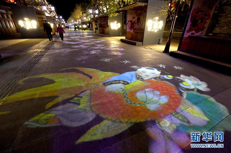 12月4日,游客在楊柳青古鎮(zhèn)步行街上欣賞年畫主題燈光。 近日,天津市西青區(qū)楊柳青古鎮(zhèn)在步行街新增9組以楊柳青年畫代表作為主題的動(dòng)態(tài)夜景燈光,講述古鎮(zhèn)與年畫的歷史。 新華社記者 岳月偉 攝