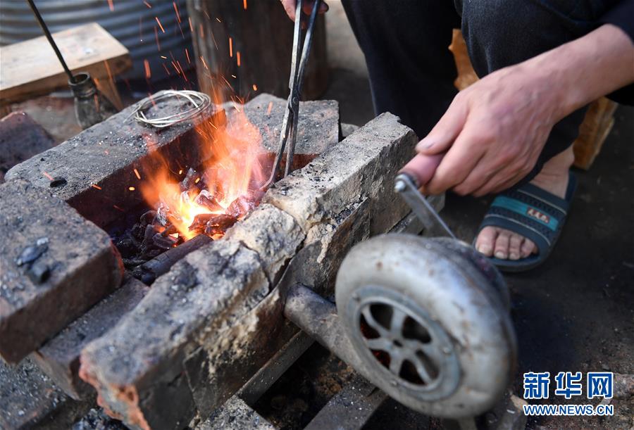 5月29日,在廣西融水苗族自治縣融水鎮(zhèn),銀匠陳四先鼓風吹旺炭火準備打造銀飾。