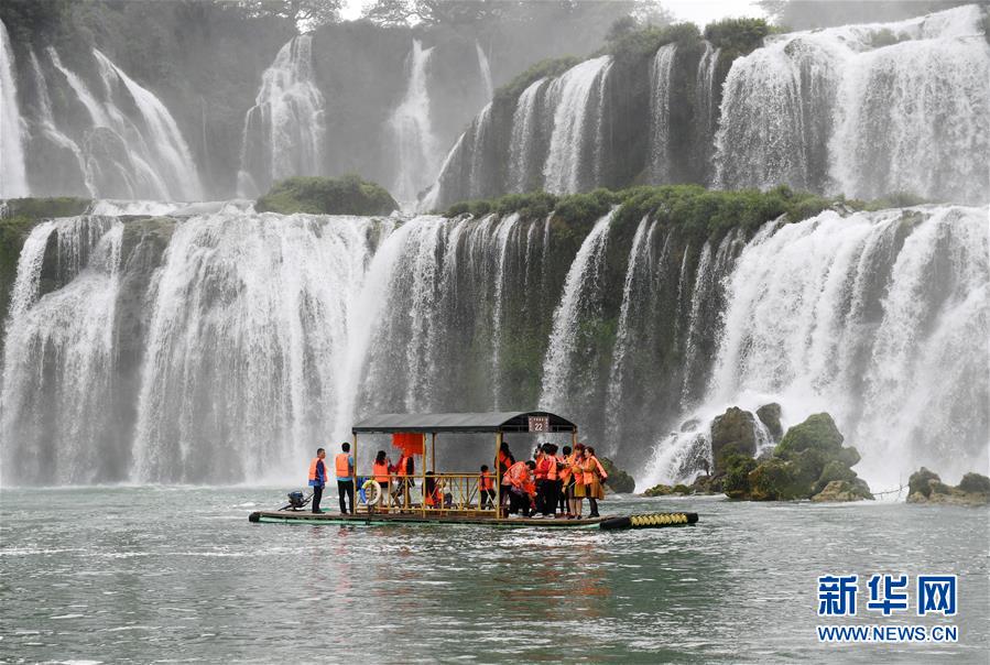 近日,隨著降雨增多,位于中越邊境的廣西大新縣德天瀑布水量增大,吸引大批游客前來觀光游覽。