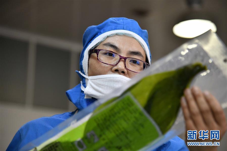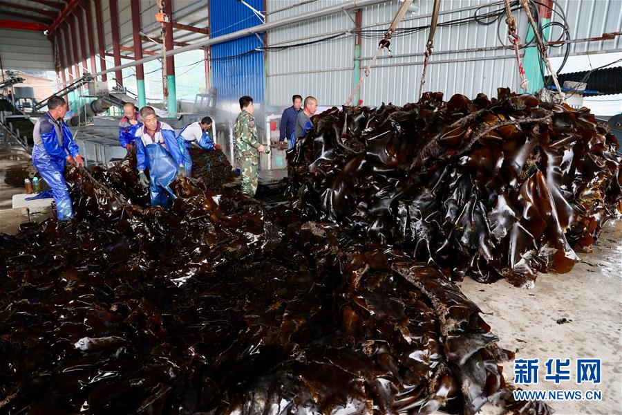 6月5日,在榮成一家水產(chǎn)養(yǎng)殖公司,工作人員在加工海帶。 近日,山東省榮成市迎來(lái)海帶收獲季。據(jù)悉,榮成市海帶養(yǎng)殖面積14.5萬(wàn)畝,年產(chǎn)海帶43.3萬(wàn)噸以上。 新華社記者林繁晶攝