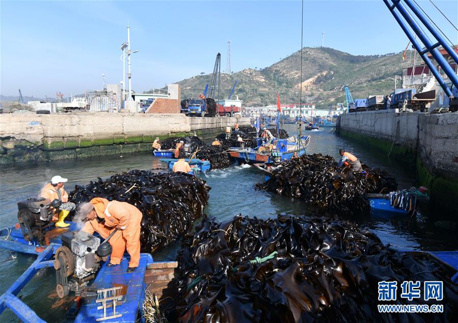4月10日,霞浦縣長(zhǎng)春鎮(zhèn)海帶養(yǎng)殖戶在埕塢碼頭吊運(yùn)海帶。近日,福建省寧德市霞浦縣30余萬(wàn)畝養(yǎng)殖海帶進(jìn)入收獲季節(jié),當(dāng)?shù)仞B(yǎng)殖戶搶抓晴好天氣,收獲海帶。海帶養(yǎng)殖是霞浦縣群眾增收致富的支柱產(chǎn)業(yè)。2018年該縣海帶產(chǎn)量14萬(wàn)余噸。新華社記者 姜克紅 攝