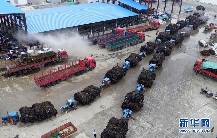 4月10日,霞浦縣長(zhǎng)春鎮(zhèn)埕塢村一家海帶加工廠內(nèi),工人在搬運(yùn)剛收獲的海帶。近日,福建省寧德市霞浦縣30余萬(wàn)畝養(yǎng)殖海帶進(jìn)入收獲季節(jié),當(dāng)?shù)仞B(yǎng)殖戶搶抓晴好天氣,收獲海帶。海帶養(yǎng)殖是霞浦縣群眾增收致富的支柱產(chǎn)業(yè)。2018年該縣海帶產(chǎn)量14萬(wàn)余噸。新華社記者 姜克紅 攝