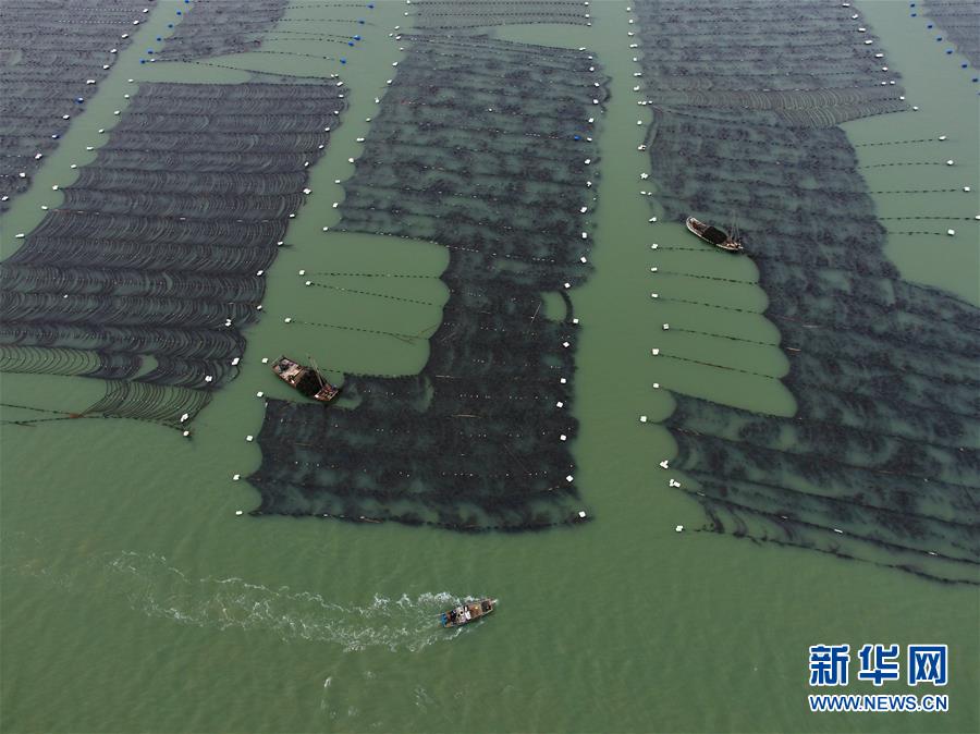 4月10日,霞浦縣長(zhǎng)春鎮(zhèn)海域,海帶養(yǎng)殖戶在用船只收獲海帶(無(wú)人機(jī)拍攝)。近日,福建省寧德市霞浦縣30余萬(wàn)畝養(yǎng)殖海帶進(jìn)入收獲季節(jié),當(dāng)?shù)仞B(yǎng)殖戶搶抓晴好天氣,收獲海帶。海帶養(yǎng)殖是霞浦縣群眾增收致富的支柱產(chǎn)業(yè)。2018年該縣海帶產(chǎn)量14萬(wàn)余噸。新華社記者 姜克紅 攝