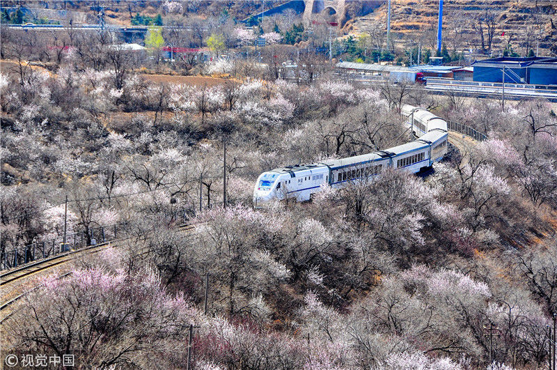 2019年3月22日,北京居庸關附近的山花盛開,S2線列車穿行在花海之中,構成一幅美麗的畫面。時永平/千龍圖像/視覺中國 編輯/陳進