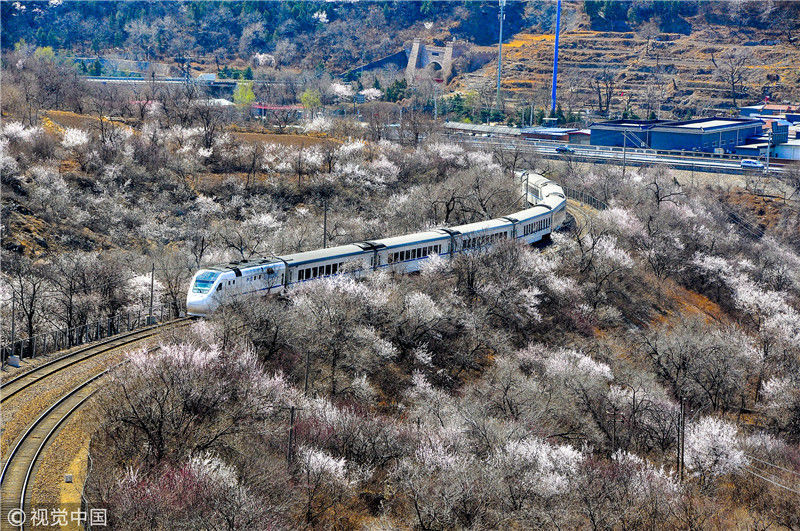 2019年3月22日,北京居庸關(guān)附近的山花盛開,S2線列車穿行在花海之中,構(gòu)成一幅美麗的畫面。
