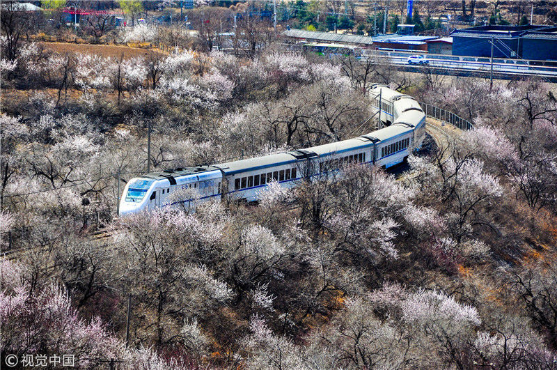 2019年3月22日,北京居庸關(guān)附近的山花盛開,S2線列車穿行在花海之中,構(gòu)成一幅美麗的畫面。