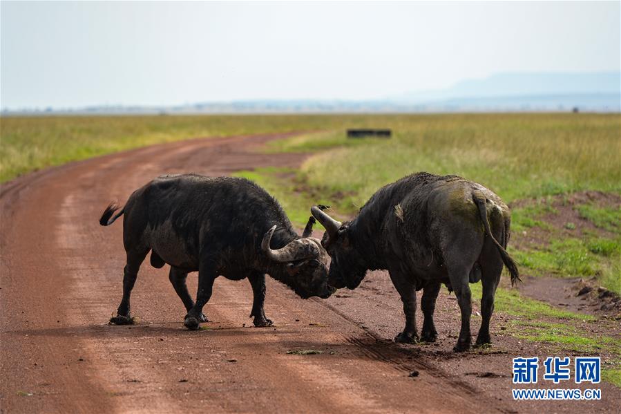 6月17日,在肯尼亞馬賽馬拉國家保護(hù)區(qū),兩頭水牛在打斗。 新華社記者 李琰 攝
